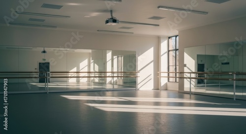 An empty dance studio, bathed in sunlight, with mirrors and wooden barres