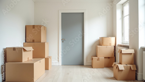 an empty hallway of a new apartment with cardboard boxes, a moving concept
