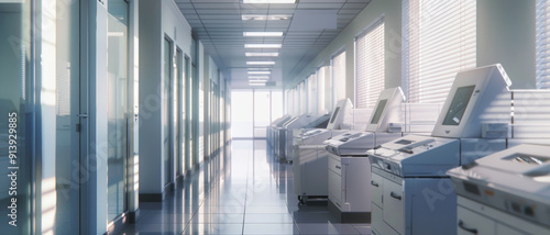 An empty office corridor with sleek, modern photocopying machines, bathed in bright natural light from large windows.
