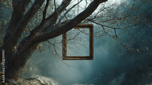 An empty ornate frame hangs from a tree branch in a misty forest with a blurred background scene view
