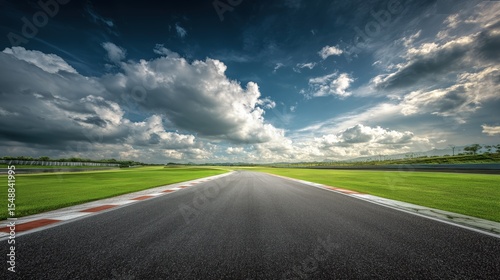 an empty race track with green grass and red-and-white curbs