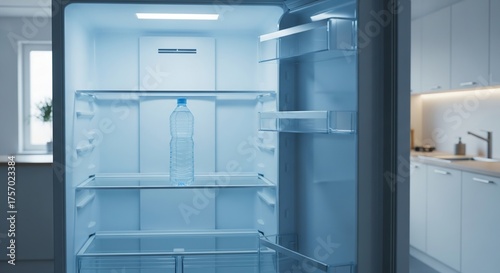An empty refrigerator with a single bottle of water on the middle shelf, illuminated by cool blue light.