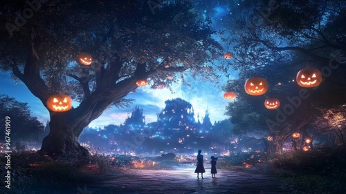 An enchanted forest Halloween festival glowing pumpkins hanging from trees