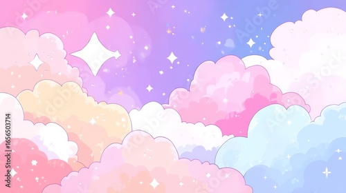 An enchanting illustration of fluffy clouds in soft pastel hues, twinkling stars,
