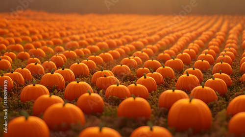 An enchanting pumpkin farm with neatly arranged rows of bright orange pumpkins.