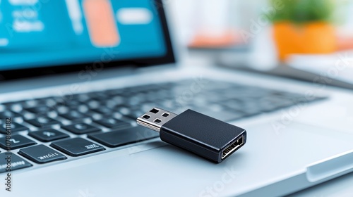 An encrypted USB flash drive rests on a laptop keyboard in a modern office. Data protection and security.