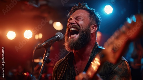 An energetic live music performance featuring a passionate male singer, pouring his emotions into the mic while being illuminated by dynamic stage lighting.