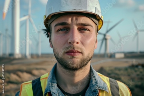 An engineer looking into the camera with a wind turbine park in the background.