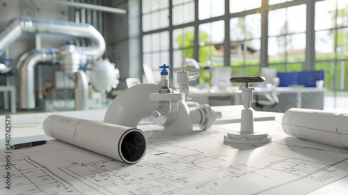 An engineering workspace features detailed blueprints and mechanical parts, emphasizing innovation and careful planning in a modern setting.