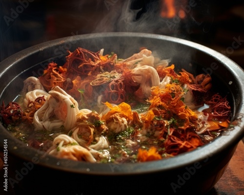 An enticing image of an Offal hot pot, with close-up details of the boiled offal pieces and the seasoned soup, snapped with a Sony Alpha a7 III, using a macro lens --v 5.2 --ar 5:4 --no cutlery knives