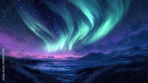 An ethereal aurora borealis sweeping across a starry sky, casting a glowing green and violet light over the arctic tundra