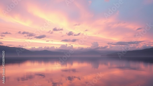 An ethereal pastel sunset over a tranquil lake reflecting the dreamy clouds above, serene, peaceful, dreamy