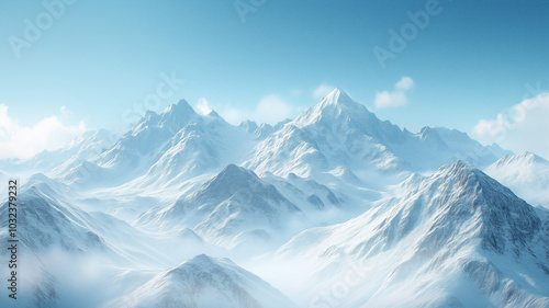 An expansive, snow-covered mountain range with soft clouds drifting among the peaks under a pale blue sky,