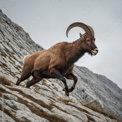 An ibex mid-stride on a steep cliff, showing strength and agility against a blank white backdrop.