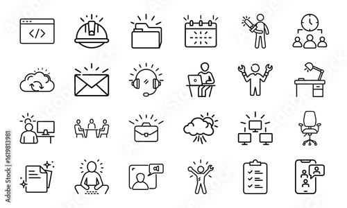 An icon pack featuring a diverse range of outline symbols for business, technology, productivity, and professional services.