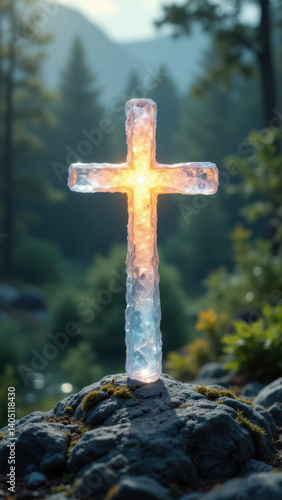 An illuminated cross surrounded by nature.