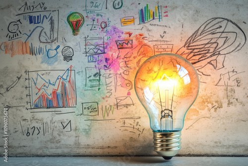 An illuminated lightbulb shines in front of a wall covered in colorful business strategy doodles and graphs, conveying the power of innovative ideas.