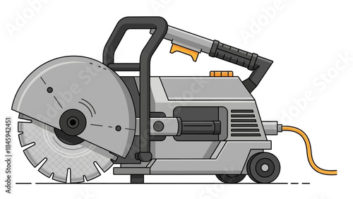 An illustration depicts a worker using a large industrial electric circular saw on a construction site outdoors.
