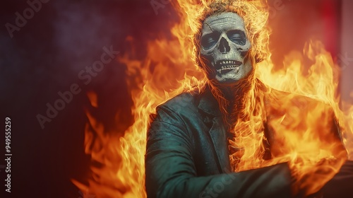 An illustration of a skull and skeleton man in a suit, engulfed in flames.