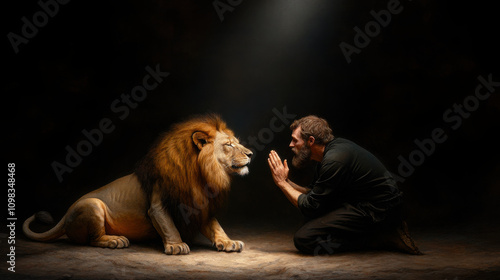 An illustration of the Daniel thrown into the lions den praying to God․