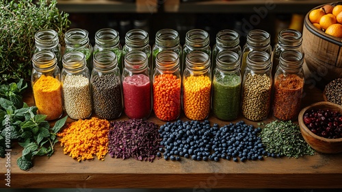 An immune boosting smoothie bar with a variety of vibrant, natural ingredients arranged artistically on a counter