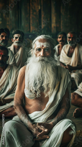 An Indian old sadhu sitting under a tree with a group of disciples