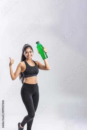 An Indian woman in black fitness attire holding up a green water bottle and showing a thumbs up for weight loss, promoting fitness, weight loss