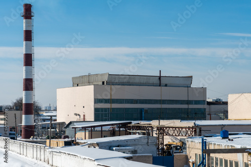 An industrial area with a large white and red chimney without smoke against a blue sky. The factory or factory is covered with snow after a snowfall. Production shutdown due to a snowstorm.