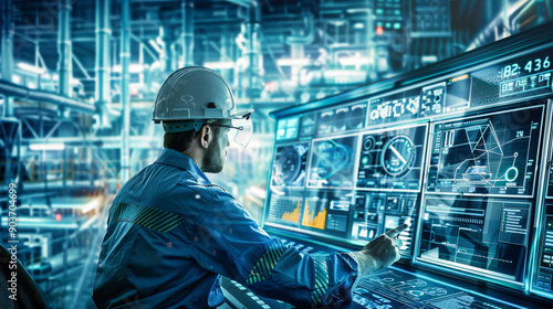An industrial engineer working at a control panel in a modern factory