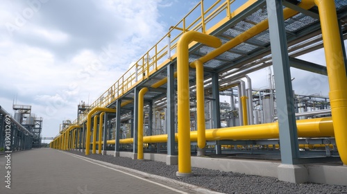An industrial landscape features a fuel processing facility with large yellow pipes running along the walkway. The cloudy sky creates a dramatic backdrop for the complex structure