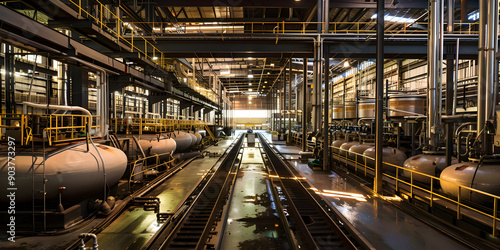 An industrial manufacturing facility showcasing large storage tanks and pipelines, illuminated by natural light from high windows, emphasizing a modern production environment