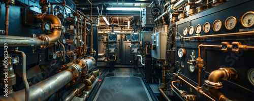 An industrial mechanical room filled with a dense array of pipes and valves, surrounded by control panels and gauges, showcasing the technical complexity.