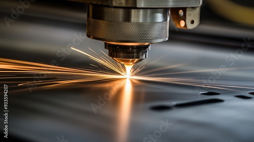 An industrial setting where a powerful laser is used to cut through a thick metal plate. The laser beam is intense and focused, generating sparks and a molten trail as it moves. The environment is