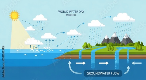 An infographic illustration showing the water cycle and groundwater flow on World Water Day