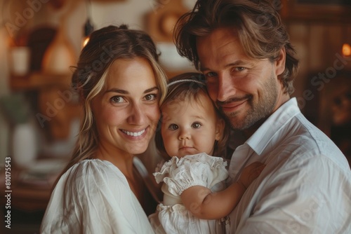 An intimate family portrait featuring two parents in white and their adorable baby