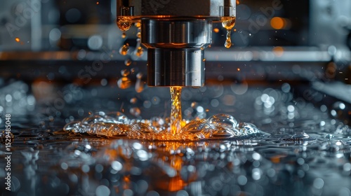 An intricate close-up of a high-tech cutting machinery showcasing fluid dynamics as water droplets intermingle with cutting sparks, representing advanced industrial technology.