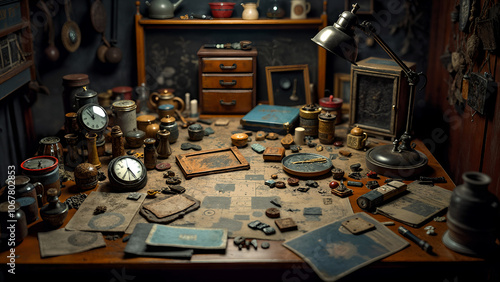 An Intriguing Desk Covered in an Eclectic Array of Various Objects, a Blend of Creativity and Discovery