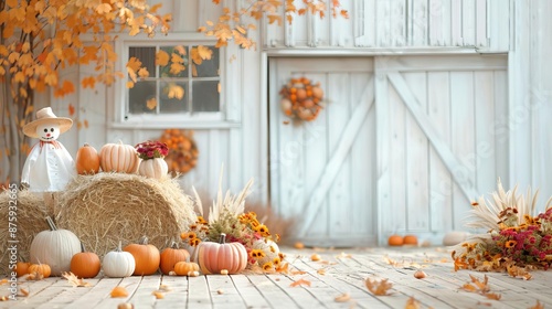 An inviting autumn day with scarecrows arranged in front of a barn, pumpkins, and hay bales, creating a rustic fall display, high detail