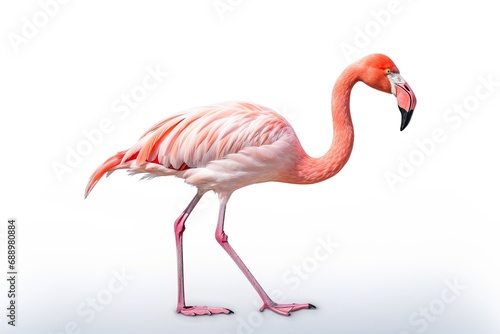 An isolated pink flamingo with vibrant plumage, embodying exotic beauty against a white background.