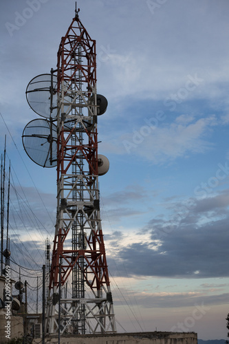 An network tower standing tall near the cliff besides a sandy beach. Dozens of wire connected to each transmission to give supply of network reception in that rural area.