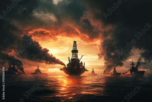 An offshore oil rig surrounded by warships and stormy skies, representing global tensions over energy resources and security risks.