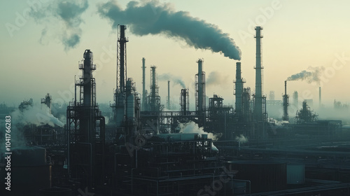 An oil refinery with massive machinery and flare stacks, symbolizing the operations of large oil companies in energy production