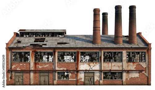 An old, abandoned factory with rusted brick walls, broken windows, and a dilapidated roof.