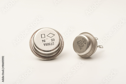 An old bipolar transistor. A bipolar transistor in a metal case. A powerful transistor.
