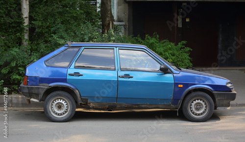 An old rusty dark-blue car with light-blue doors on the road, Dybenko Street, St. Petersburg, Russia, June 2021