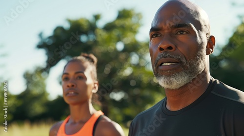 An older Black man and woman enjoy exercising together in a vibrant outdoor setting