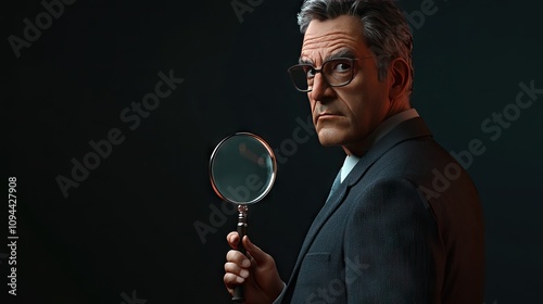 An older Caucasian man in a suit holds a magnifying glass, exuding an air of curiosity and intrigue against a dark backdrop.