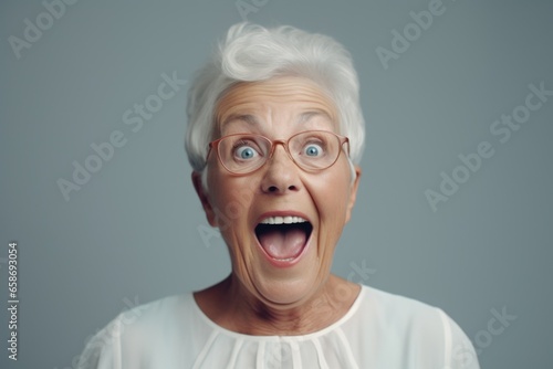 An older woman with glasses making a funny face. This image can be used to depict humor and lightheartedness.