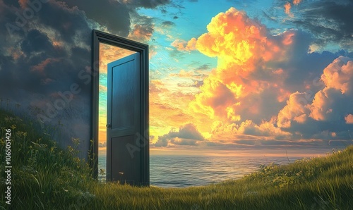 An open door reveals a stunning view of the ocean and colorful clouds, highlighting a serene moment on a grassy hilltop