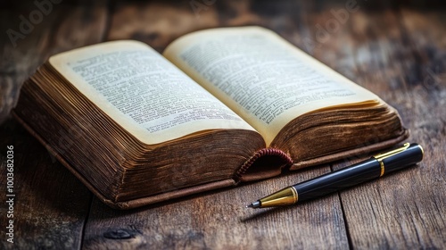 An open vintage book on a wooden surface with a pen placed beside it, symbolizing knowledge and literature.